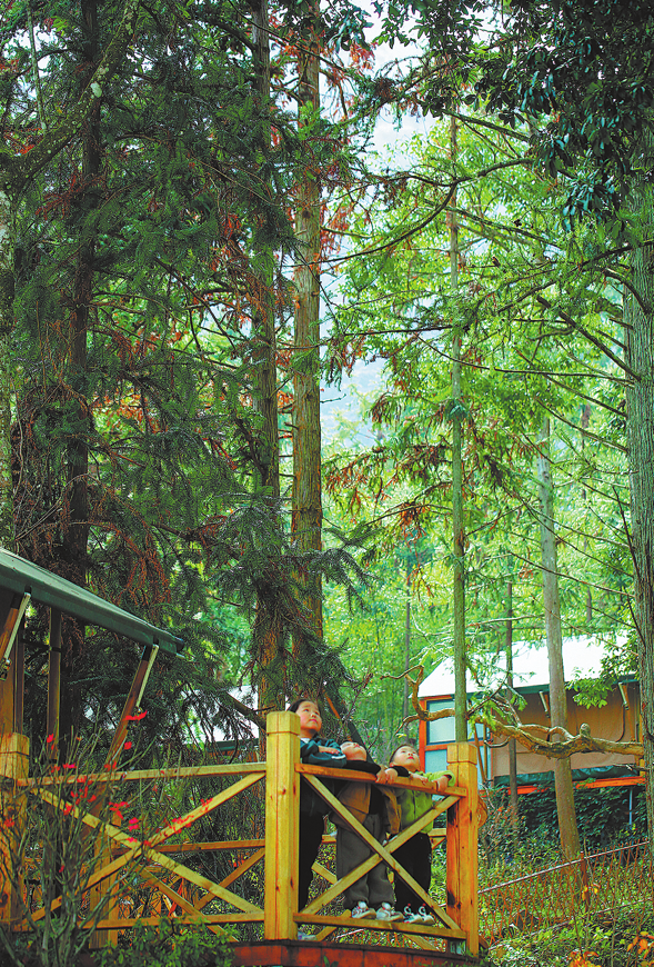 Децата гледат с чудо на извисяващите се дървета в гора в село Дакси във Фужоу през 2024 г. Китай всекидневник