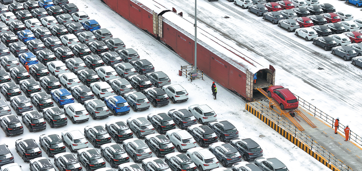 Произведени в Китай автомобили се разтоварват от влак в пристанище Янтай за износ от провинция Шандонг на 18 януари. TANG KE/ЗА КИТАЙ ДАЙЛИ