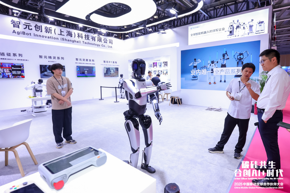 AgiBot демонстрира най-новите роботи на China Mobile Global Partners Conference 2025 в Гуанджоу, провинция Гуангдонг. [Photo provided to chinadaily.com.cn]
