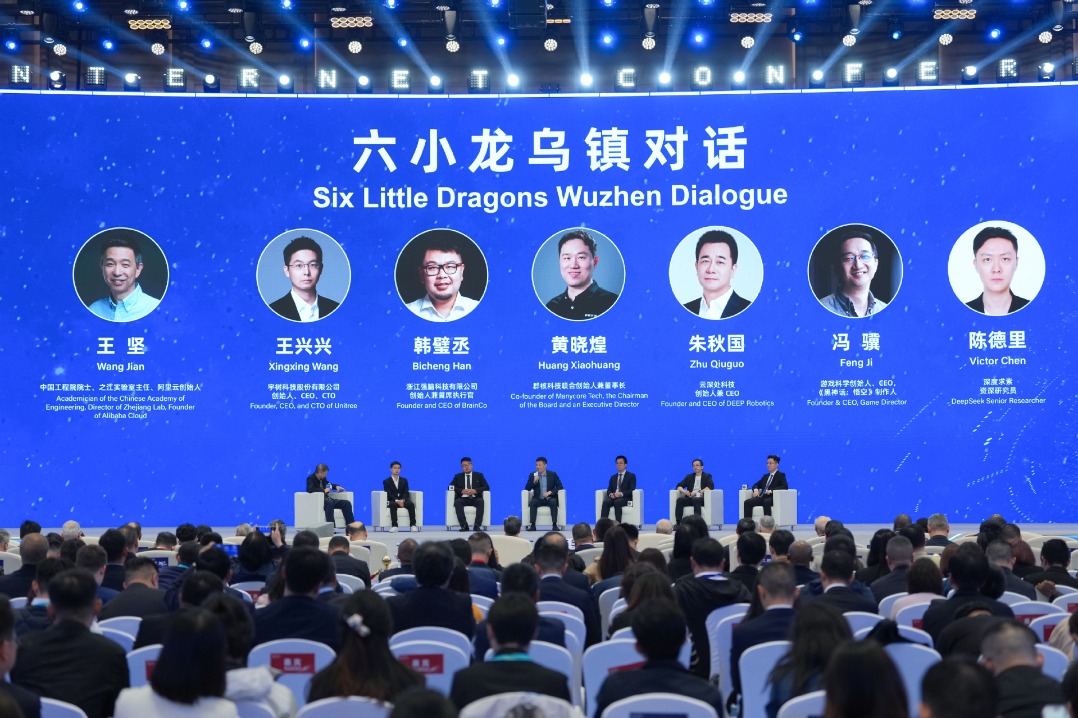 Като акцент на Световната интернет конференция през 2025 г. Wuzhen Summit, ръководители от „Шестте малки дракона“ участват в диалози, обменяйки мнения относно най-новите разработки в областта на изкуствения интелект и други авангардни технологии, и изследват идеи, фокусирани върху междусекторното сътрудничество за справяне с глобалните проблеми в Wuzhen, провинция Zhejiang, на 7 ноември 2025 г. [Photo/Xinhua]
