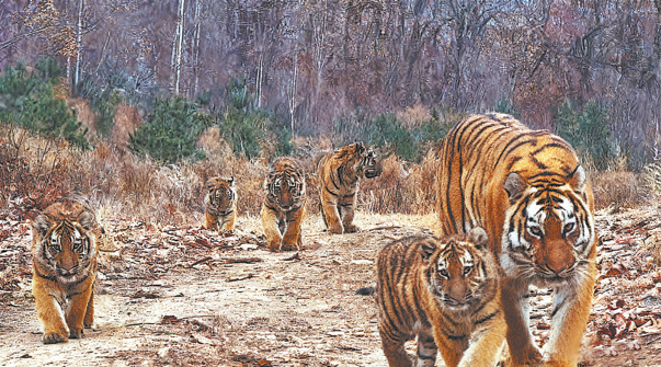 Дива амурска тигрица и нейните пет малки са заснети на камера в Националния парк за тигри и леопарди в Североизточен Китай в Хунчун, провинция Джилин, през ноември. КИТАЙ ДЕЙЛИ