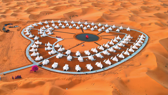 Хотел за палатки в живописната зона Шапотоу предлага на посетителите завладяващо изживяване на отличителния пустинен пейзаж в автономния регион Нинся Хуей в четвъртък. ZHU WENJUN/ЗА КИТАЙ ЕЖЕДНЕВНИК