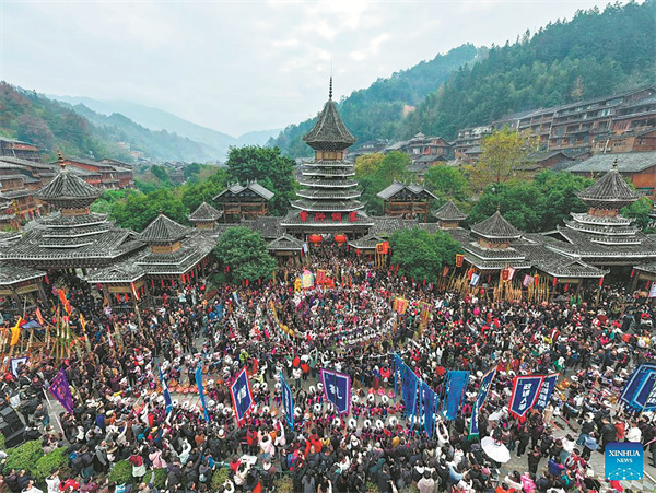 Снимка с дрон, направена на 20 декември, показва хора, празнуващи годишния новогодишен фестивал Dong в село Zhaoxing Dong в автономната префектура Qiandongnan Miao и Dong, провинция Guizhou.[Photo provided by Long Jianrui/China Daily]