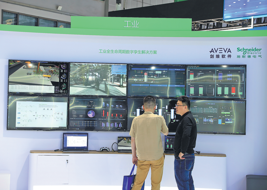 Посетителите проверяват продуктите на щанда на Aveva по време на високотехнологично изложение в Шанхай. CHINA DAILY