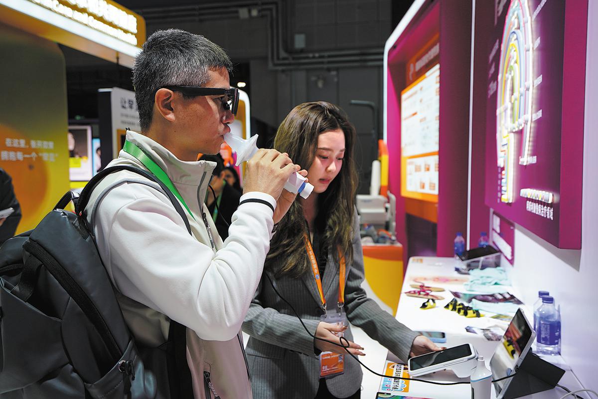 Посетител изпробва устройство за тестване на белодробната функция на щанда на AstraZeneca на 8-ото Китайско международно изложение за внос в Шанхай на 7 ноември. Fan Yuqing/Xinhua