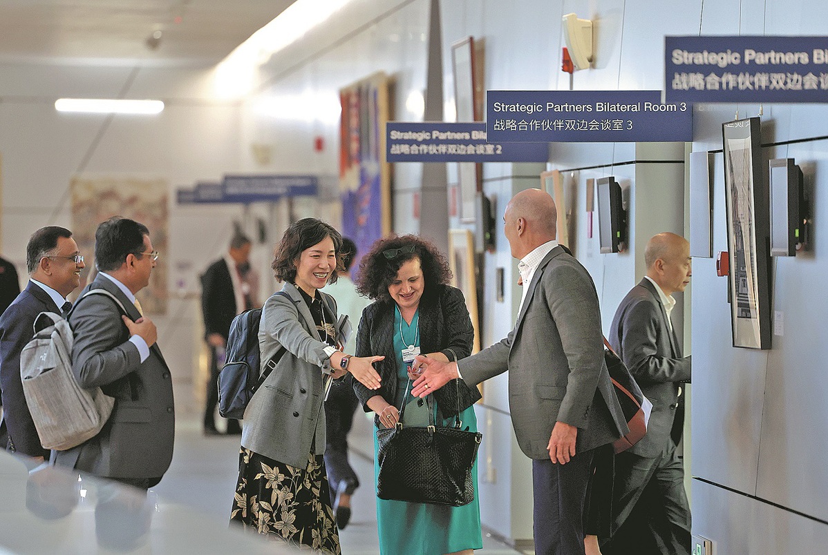 Гостите се ръкуват помежду си през 2024 г. Летните Давос в Далиан, провинция Лиаонинг, на 22 август. Yao Jianfeng/Xinhua